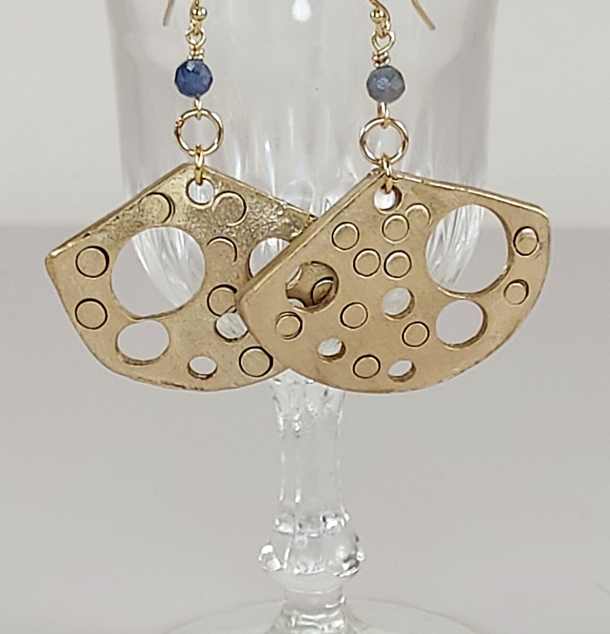 These artisanal handcrafted fan-shaped Bronze beads, kiln-fired to create rich texture designed with decorative, variable sized round openings that give it a mid-century modern look. Each Bronze bead dangles from a 4mm faceted Sapphire bead, which is hand wire wrapped to the 14K Gold filled ear wires for a finished look. Designed and handcrafted bykatejewelry in California. Wear a piece of art!. Arrives in a silk bag.