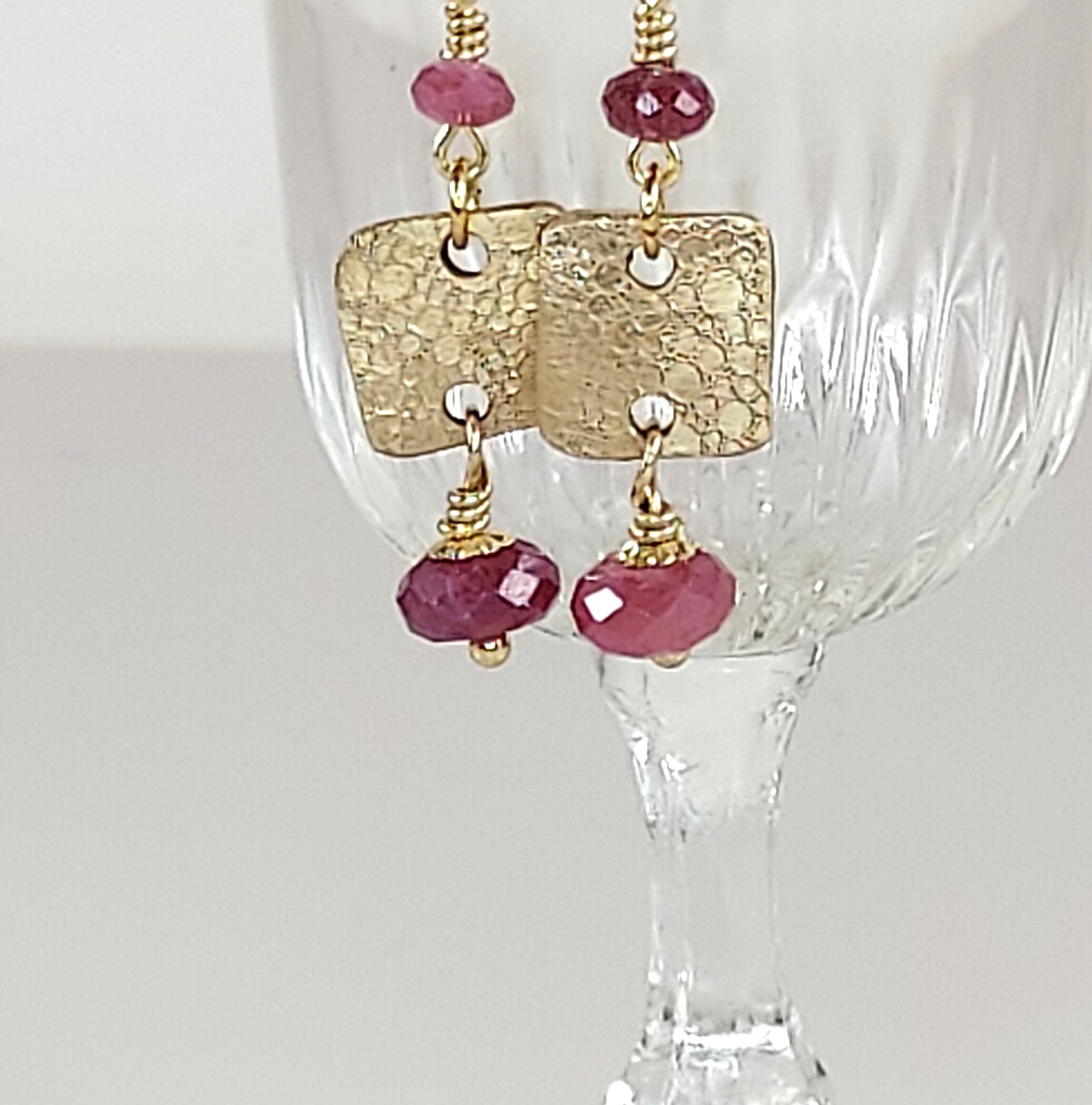 A dance of fire and light - each earring has a kiln-fired textured link, its warm glow shaped by hand and touched by the flame. Above and below, delicate faceted Pink Tourmaline gemstones shimmer with soft rose hues, wire-wrapped with care to capture their natural sparkle. Finished with graceful 14K Gold filled ear wires, these earring embody timeless elegance and the beauty of handcrafted artistry. Designed and handcrafted in California bykatejewelry. Wear a piece of art! Arrives in a silk bag.
