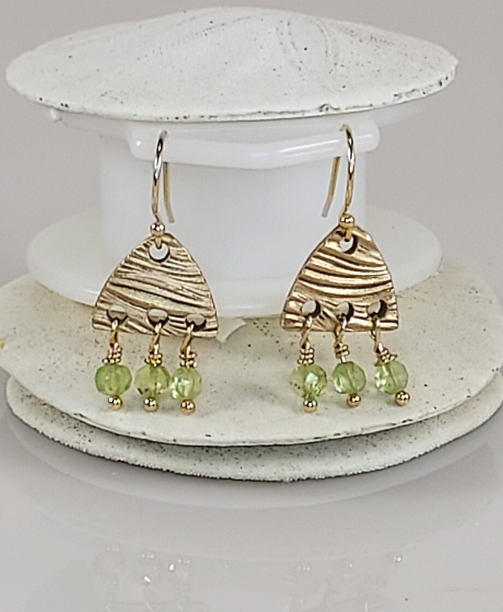 Delicately handcrafted with a kiln-fired Bronze link, these earrings feature 3 hand wire-wrapped shimmering Peridot gemstones that dangle with natural movement and sparkle. Finished with 14K Gold filled ear wires for a touch of warmth and elegance. Each pair is uniquely made by hand. Length is 3/4 inches. Designed and hand-crafted bykatejewelry in California. Wear a piece of art!