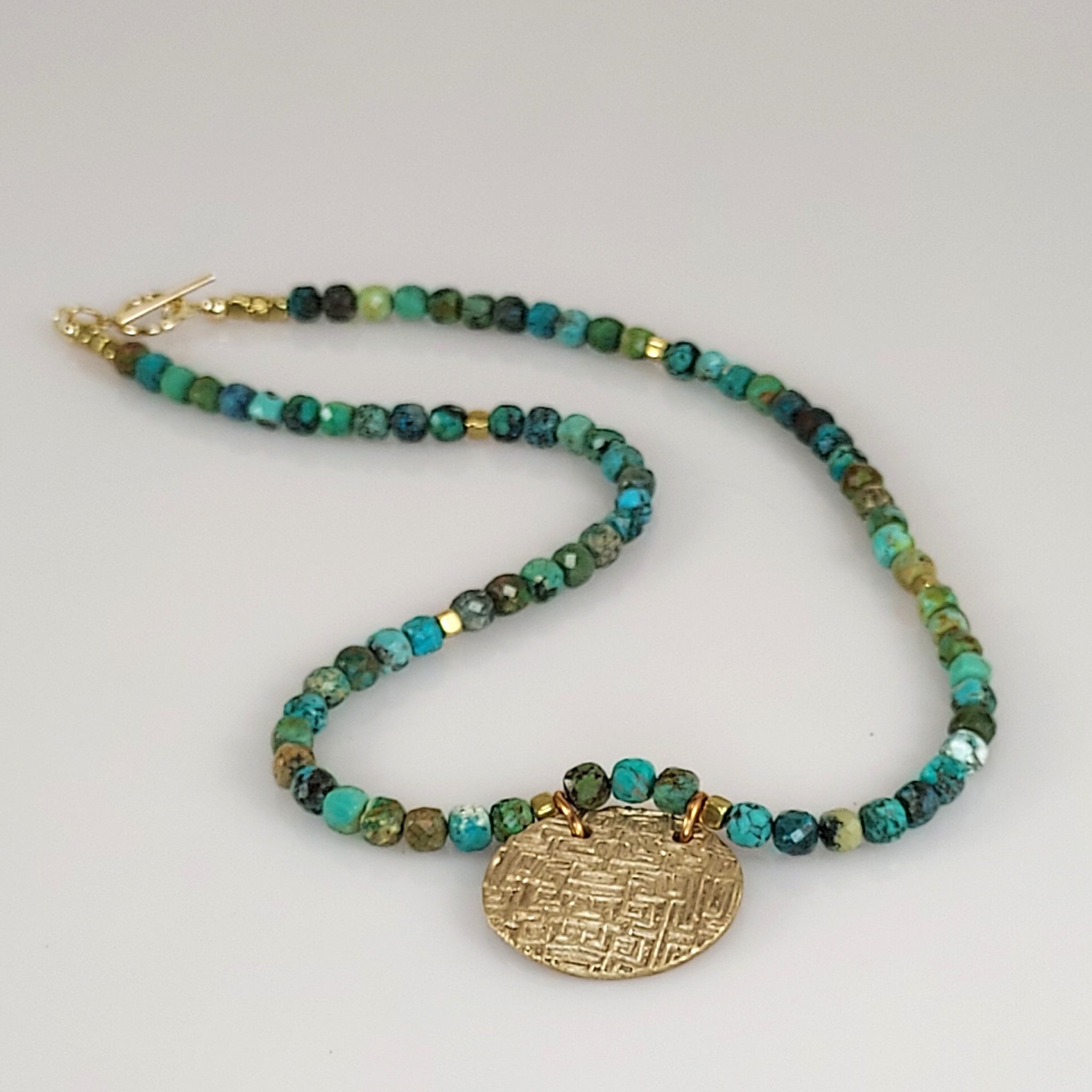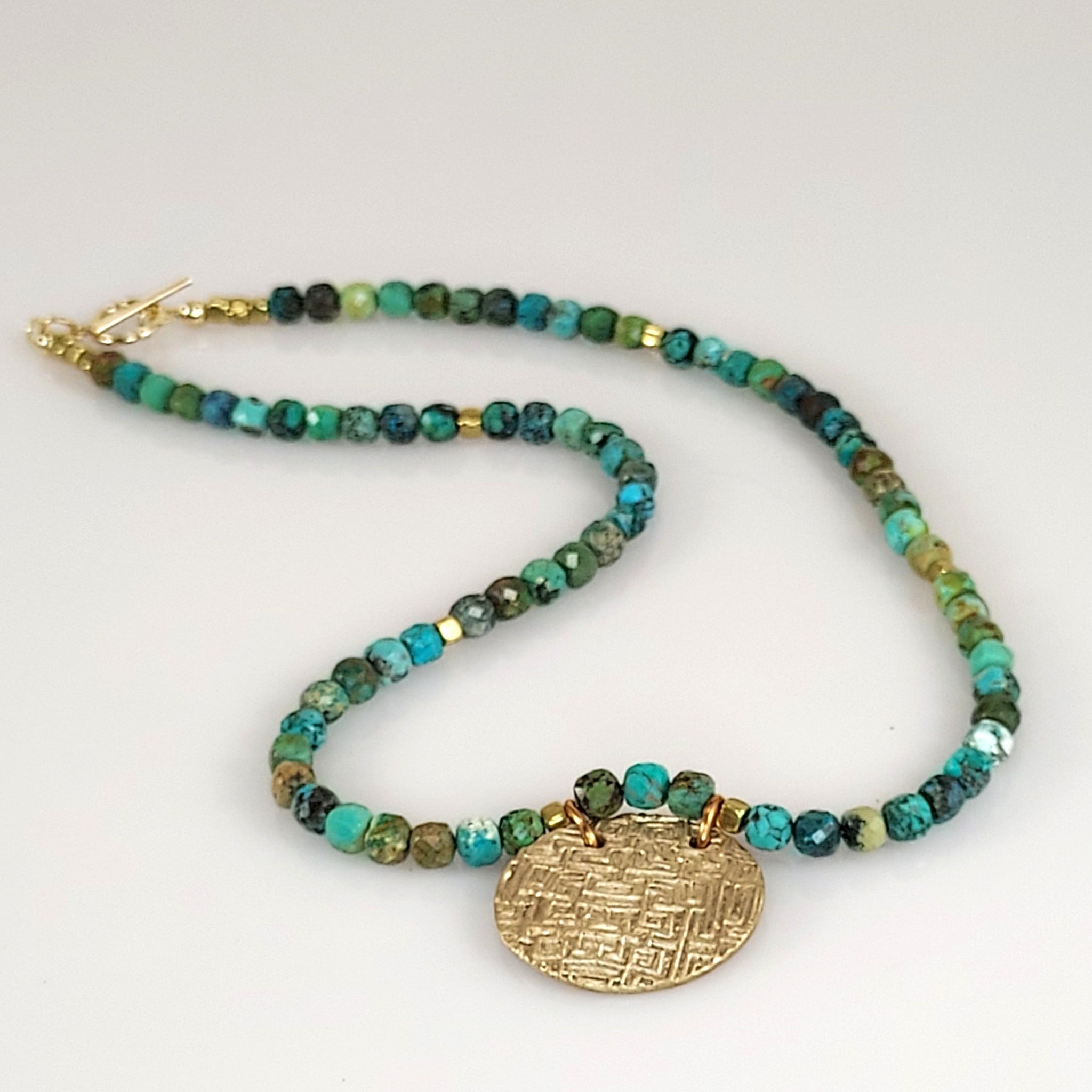This stunning handmade necklace features cubed, natural faceted Turquoise beads that shimmer with earthy blue-green tones. At its center hangs a hand-sculpted and kiln -fired textured Bronze pendant, radiating warmth and artisanal charm. The piece is finished with a secure 14K Gold-filled toggle clasp, adding a touch of luxury and contrast. Measuring 18 inches in length, this one-of-a-kind design beautifully blends rustic elegance with timeless sophistication - perfect for everyday wear or special occasions. Designed and handcrafted bykatejewelry in California.